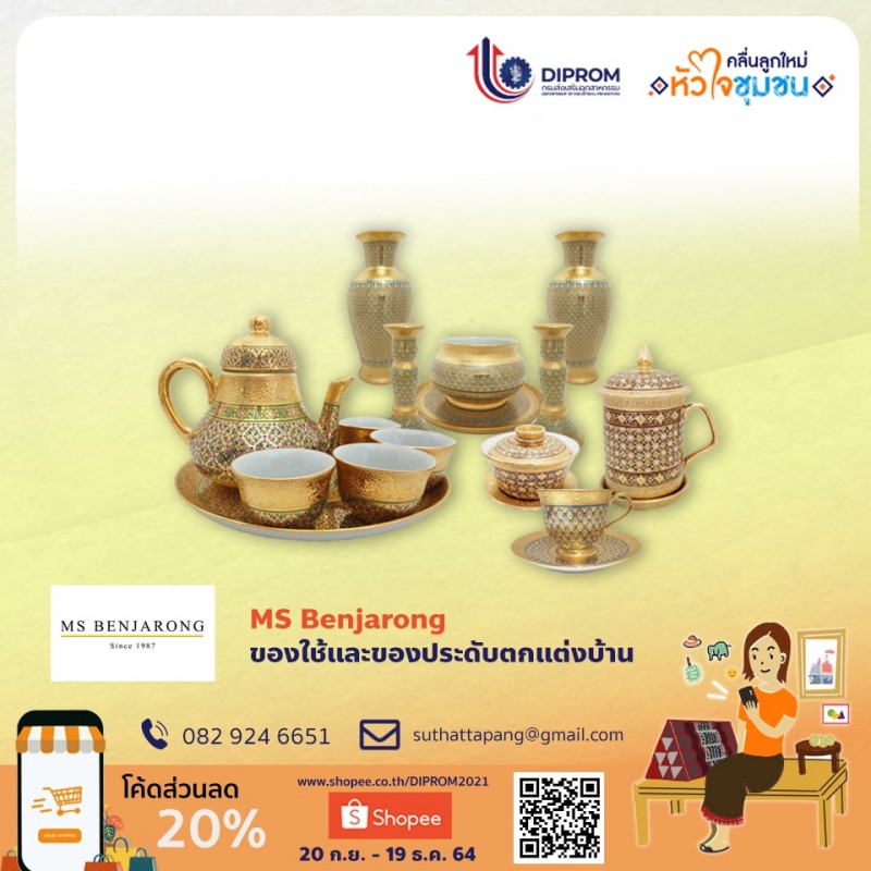 นางสาวสุทัตตา สุรินทร์รัฐ เจ้าของผลิตภัณฑ์ Ms benjarong สินค้าที่ร่วมจำหน่ายในแคมเปญเป็นเครื่องเบญจรงค์ลายน้ำทอง เป็นงานเขียนมือที่นำเอาน้ำทองมาเขียนบนเซรามิก ส่วนใหญ่จะทำเป็นของใช้ ของตกแต่ง เช่น ชุดน้ำชา แก้วน้ำ จาน ชาม โคมไฟ เน้นใช้งานได้จริง และแบรนด์ของเราจะเน้นความละเอียดในการสร้างสรรค์ชิ้นงานแต่ละชิ้น ด้วยงานฝีมือคนไทยที่ประสบการณ์กว่า 30 ปี ผลจากการเข้าร่วมแคมเปญ “ตลาดสินค้าคลื่นลูกใหม่หัวใจชุมชน” โดย DIPROM ร่วมกับ SHOPEE แม้ว่าในส่วนของยอดขาย จะไม่เพิ่มขึ้นไม่แตกต่างจากก่อนเข้าร่วมแคมเปญมากนักเนื่องจากยังอยู่ในช่วงแรก แต่เมื่อมีการนำสินค้าไปไลฟ์ผ่านอินฟลูเอนเซอร์ทำให้มีคนรู้จักเพิ่มขึ้นและเข้ามาติดตามร้านเพิ่มมากขึ้น